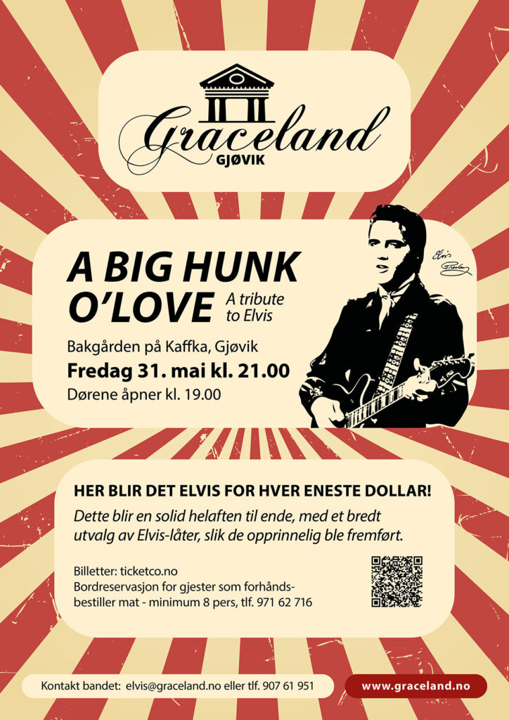 Her blir det Elvis for hver eneste dollar, og Graceland Gjøvik kan love at dette blir en solid helaften til ende, med et bredt utvalg av Elvis-låter, slik de opprinnelig ble fremført.